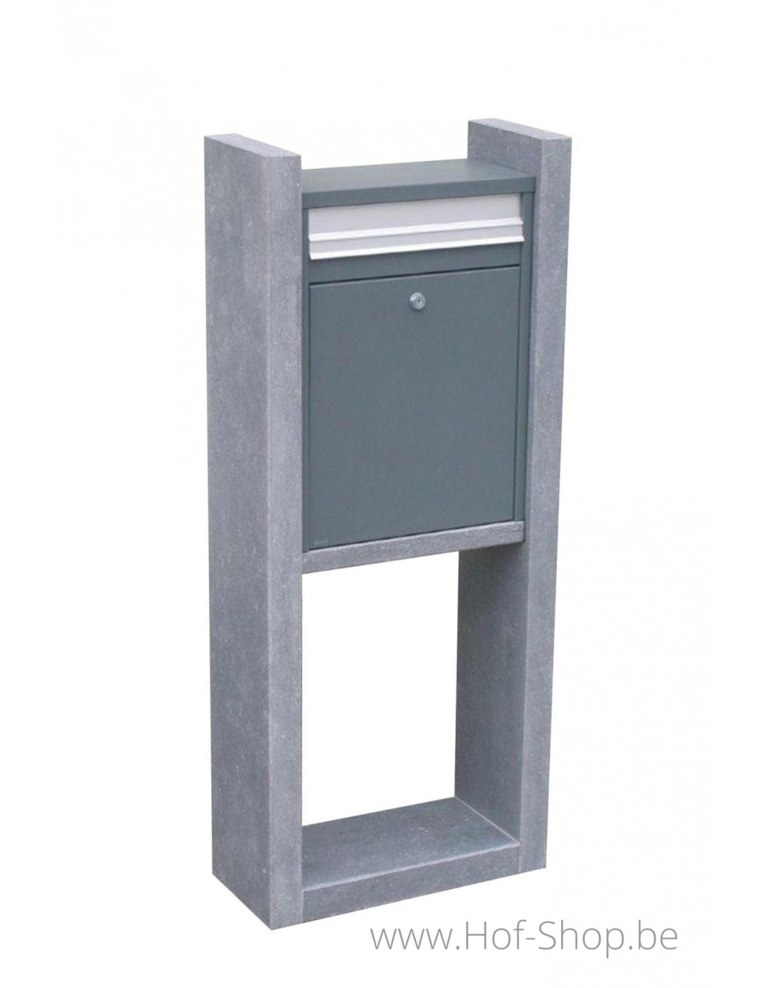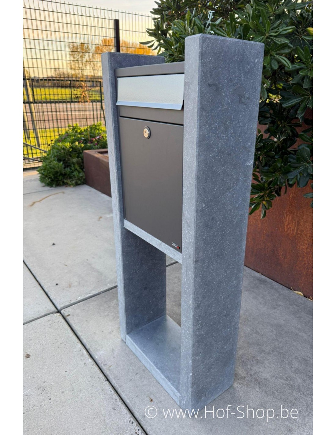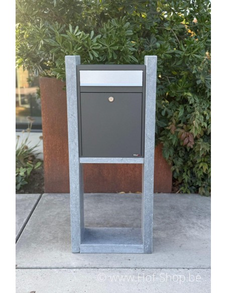 Vigo est une boîte aux lettres élégante en pierre bleue belge combinée à un boisseau en acier thermolaqué. Parce que la boîte aux lettres n'est pas très profonde et que la porte est à l'avant, Vigo est idéal si vous avez un espace limité !