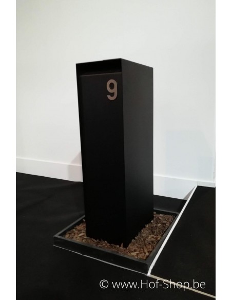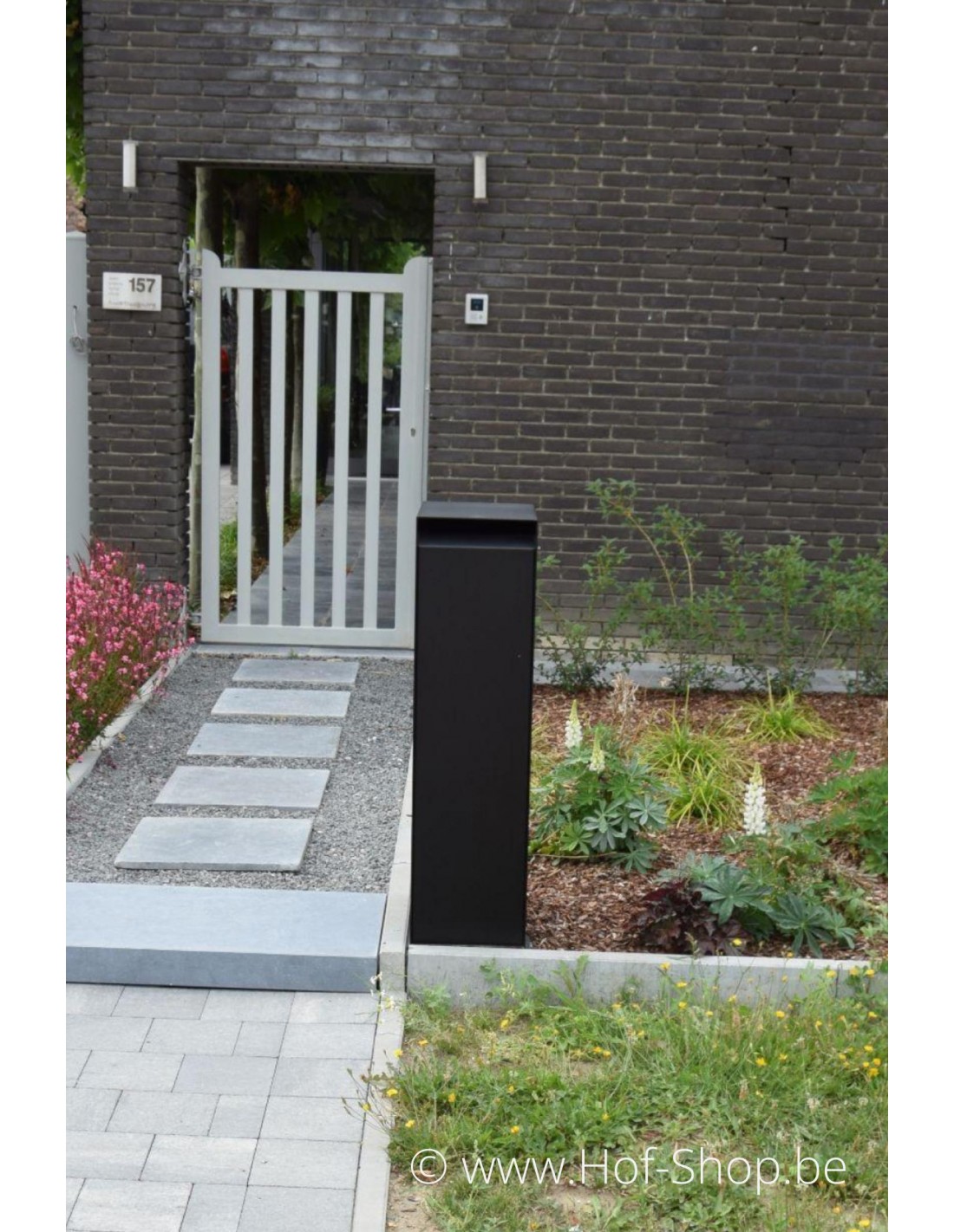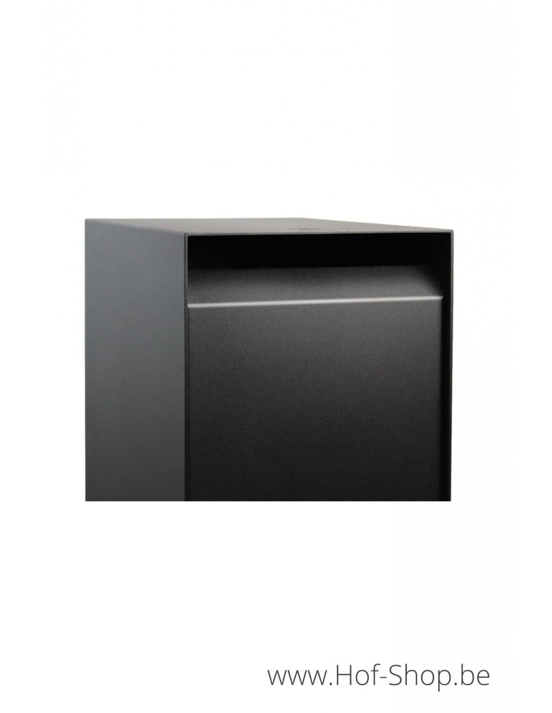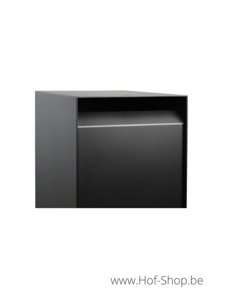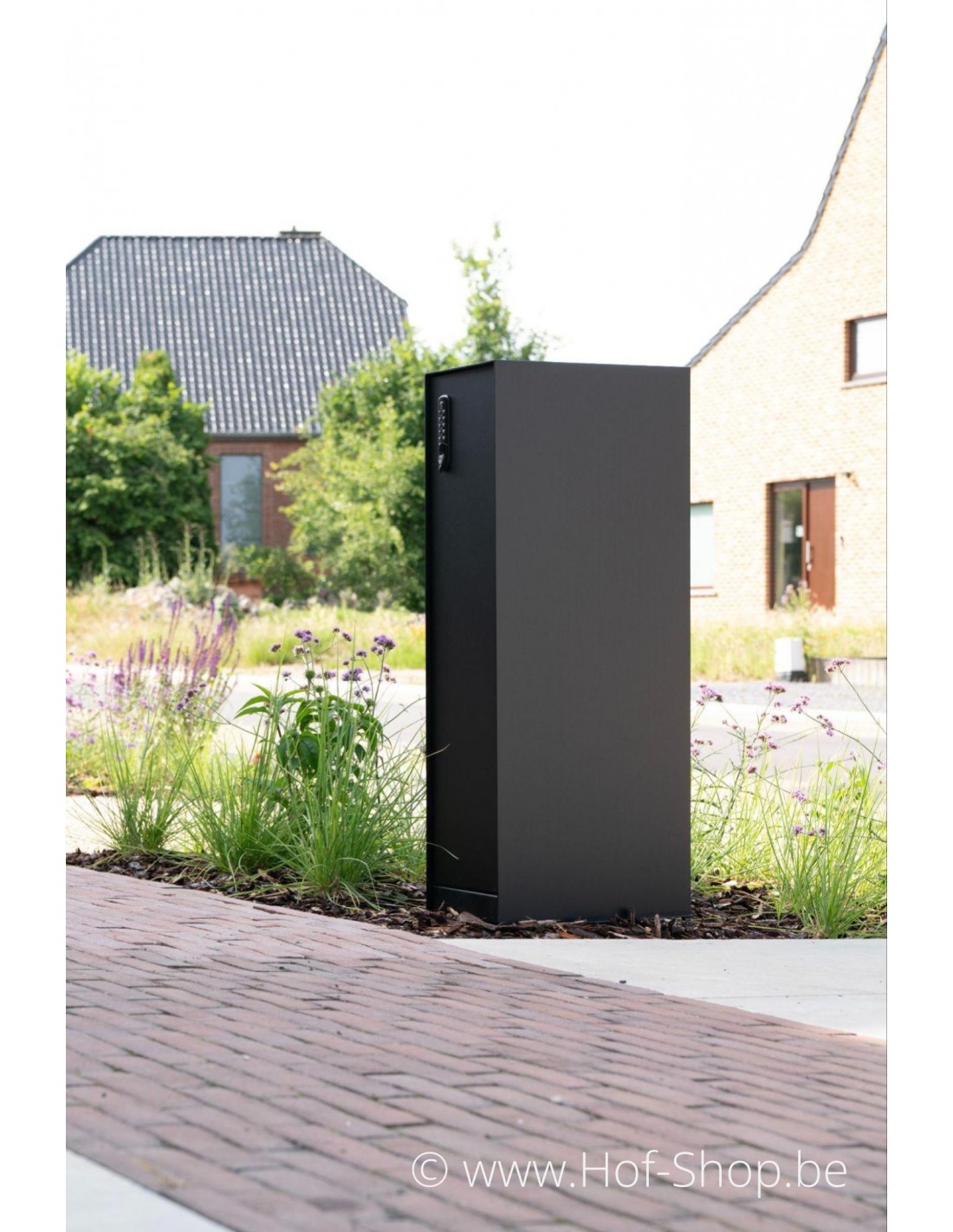 La boîte aux lettres est fabriquée en aluminium inoxydable (3 mm d'épaisseur) avec une peinture texturée de haute qualité (mat RAL 9005 TXT noir). Les boîtes aux lettres eSafe sont testées et approuvées par Bpost! Toutes les couleurs RAL sont possibles. Il suffit de nous le demander.