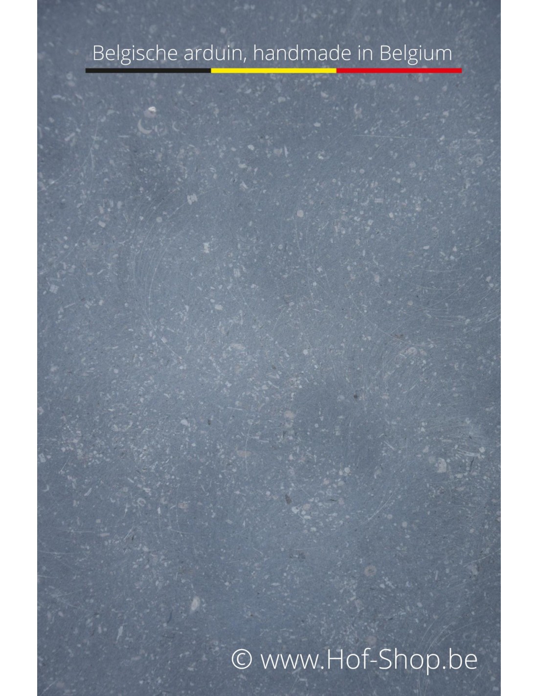 De gebruikte natuursteen is Belgische arduin. Deze natuursteen heeft een gesloten structuur en is dus niet poreus. Een ideaal materiaal dus voor onze weersomstandigheden.