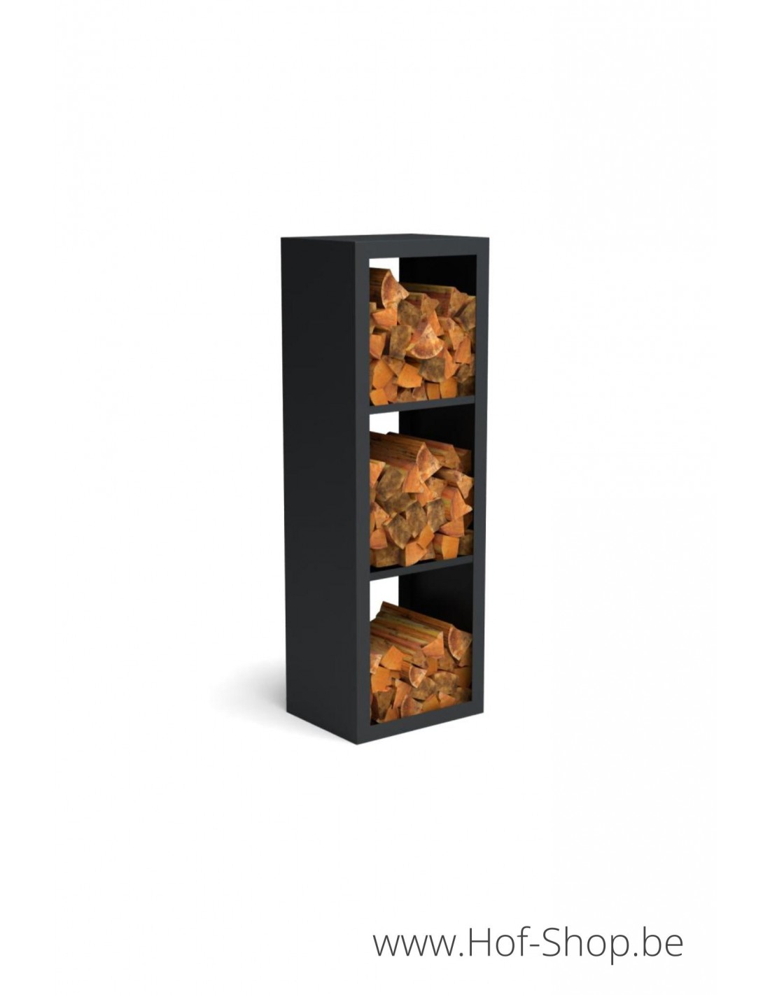 Deze strakke zwarte houtopslag kan zowel binnen als buiten geplaatst worden. In de bodem zijn afwateringsgaten voorzien; deze kunnen ook gebruikt worden om de houtberging te verankeren.